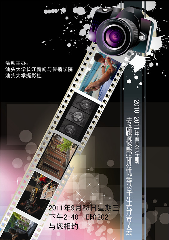 “一个关于修车铺与一个梦想的故事,一个关于一群老人与麻风村的故事,一个关于三轮车与一个女人的故事,一个关于少年与跳水的故事。”一些光和影的定格,一些欢乐与悲伤的收集,一些坚持与放弃的记录。来参加我们的“2010年春季学期专题摄影优秀学生分享会”吧!为你娓娓道来熟悉又陌生的岁月故事! 时间:9月28日周三下午2:40pm—4:30pm 地点:E阶202