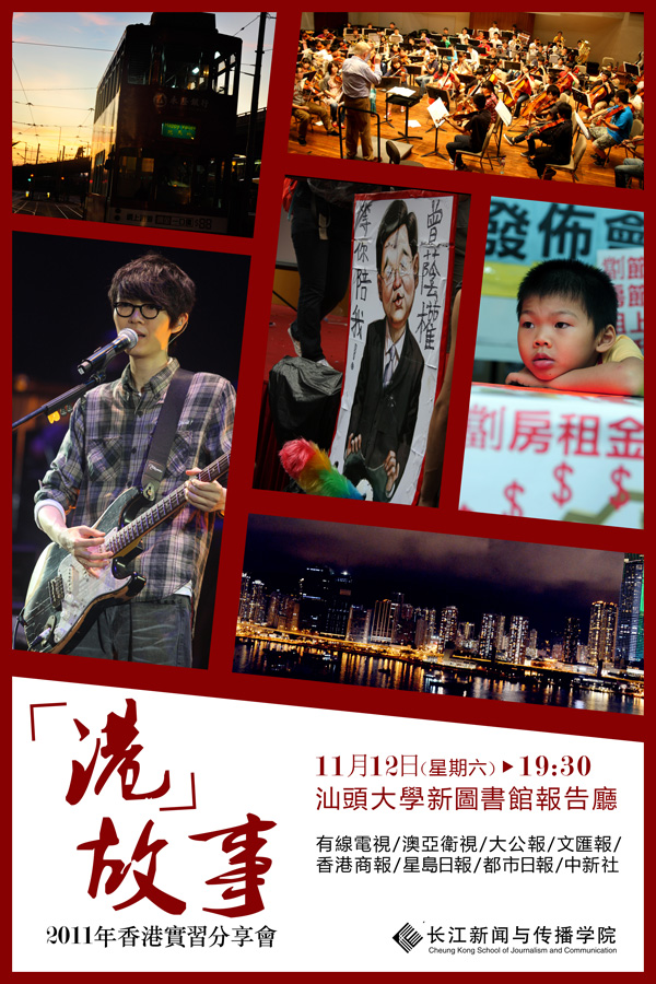 长江新闻与传播学院15名大三学生和一名研究生,今年暑假前往香港媒体实习将近两月,收获丰富。本星期六(12日),他们将向同学汇报香港实习的经历、心得以及见闻。欢迎全院同学参加,老师们光临指导。