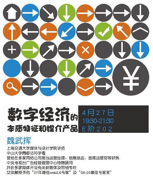 魏武挥,上海交通大学媒体与设计学院讲师,中山大学南都访问学者,业内知名独立TMT类博客(weiwuhui.com),于1999年末投身互联网业,曾经在多家网络公司担当运营经理、信息总监、首席运营官等职务,2006年进入大学执教,教授《新媒体导论》、《互联网实务》、《社会化营销》等新媒体新营销类课程,有丰富的行业实务经验和理论研究水平。