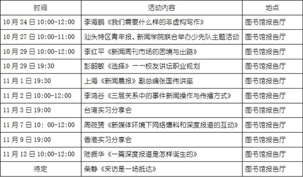 今年11月8日是第13个中国记者节,新闻学院将结合教学实践,举办系列学术活动,让喜爱新闻的师生有机会走近名记,与喜爱的新闻人聊天(活动内容详见附件)。