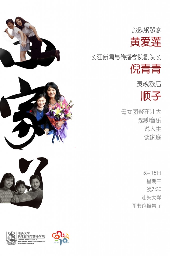 5月15日(本周三)晚上7:30图书馆报告厅,旅欧钢琴家黄爱莲、长江新闻与传播学院副院长倪青青及灵魂歌后顺子,母女团聚在汕大,一起聊音乐,说人生,谈家庭。她们将带来一场谈话的盛宴,精彩等着你,不见不散。