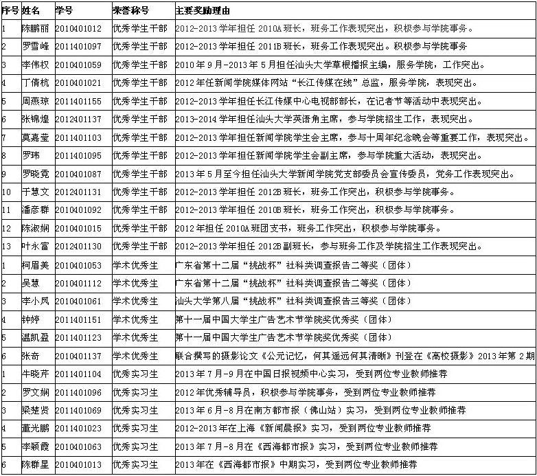 根据《学院优秀学生评选办法》,以上申请同学经院学生事务委员会评选,评定陈鹏丽等13名同学为2012-2013学年优秀学生干部,柯眉美等6人为2012-2013学年学术优秀生,陈群星等6人为2012-2013学年优秀实习生。