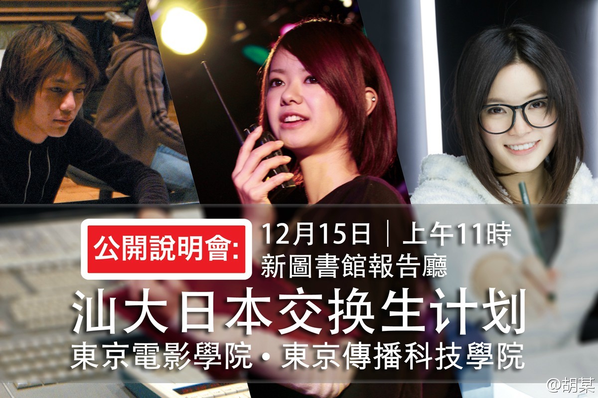 内容:东京电影学院,东京设计科技学院和动漫学院的平井伸孝老师将会到场说明他们的教学方法,欢迎对日本交换生计划有兴趣的同学参加。