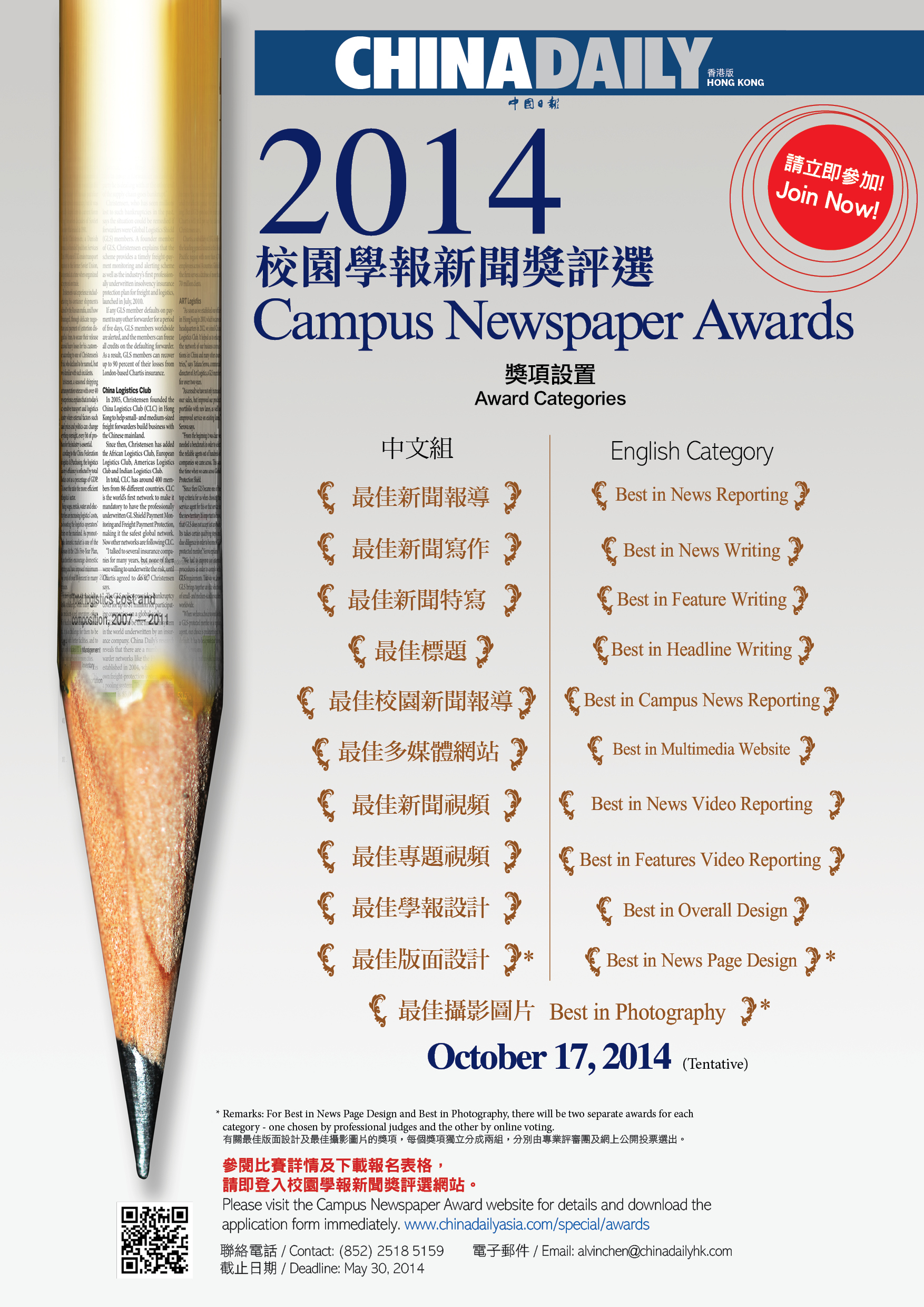 中国日报香港版 2014校园学报新闻奖评选活动海报