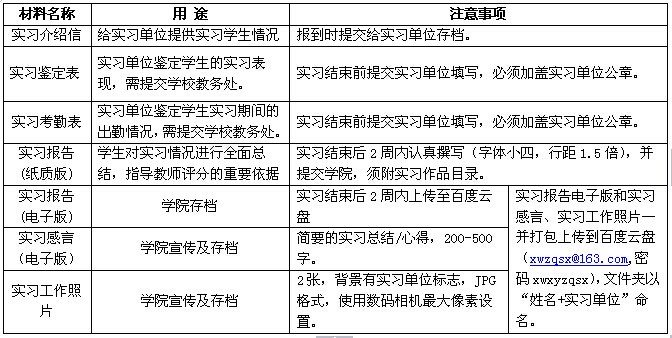 11、实习结束后2周内将实习材料(见下表要求)提交学院,以便统一评分并登陆成绩,相关表格请看附件。