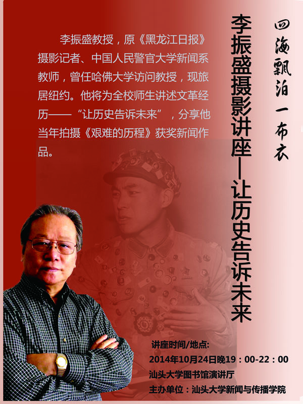 嘉宾简介:李振盛,1963年毕业于长春电影学院摄影系,在黑龙江日报社任摄影记者20年,在北京国际政治学院(后更名中国人民警官大学)新闻系执教新闻摄影15年。1996年应哈佛大学邀请赴美国访问讲学、访问教授,现旅居纽约。期间应邀担任华文月刊《天下华人》杂志总编辑。