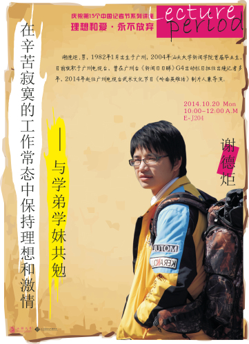 为庆祝11月8日第十五个中国记者节,长江新闻与传播学院特邀请业界知名新闻人与校友嘉宾,举办2014“理想和爱,永不放弃”系列讲座,向同学们分享光荣与梦想。