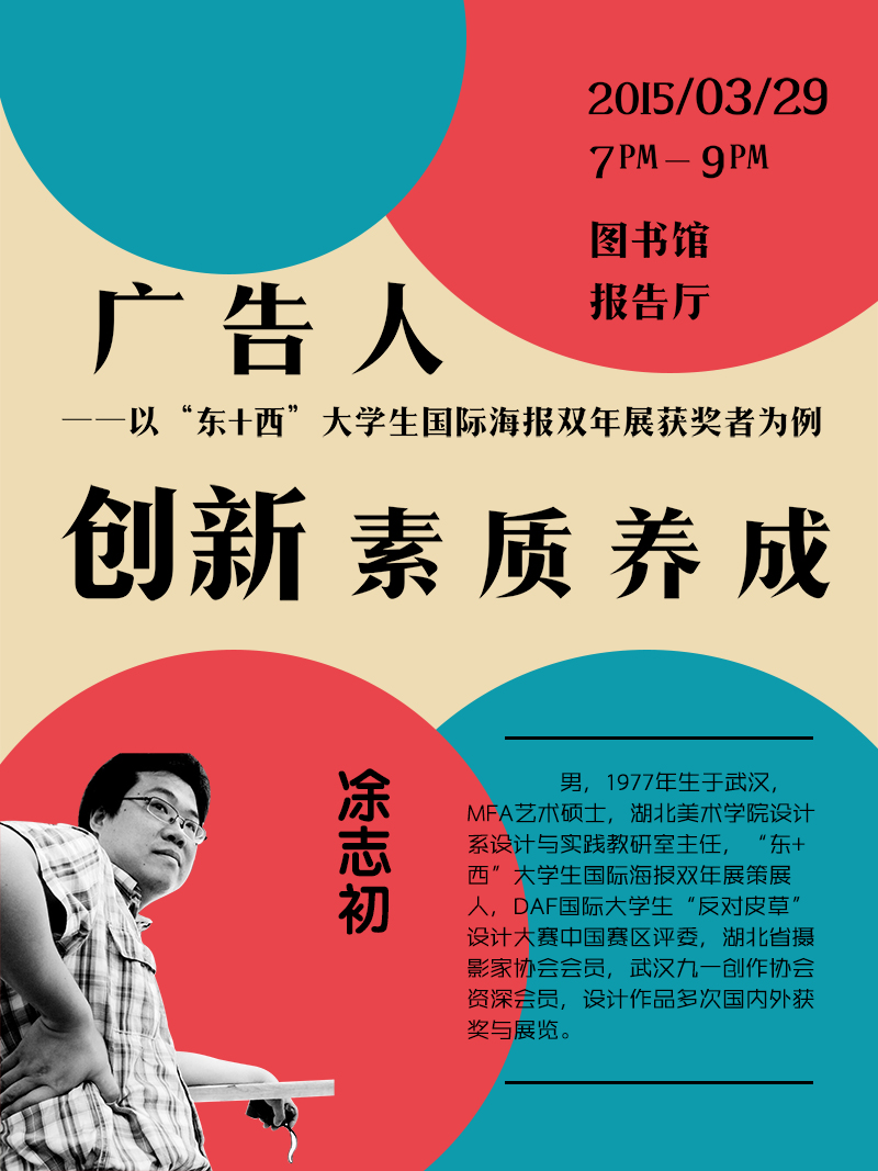 凃志初,男,1977年生于武汉,MFA艺术硕士,湖北美术学院设计系设计与实践教研室主任, “东+西”大学生国际海报双年展策展人,DAF国际大学生“反对皮草”设计大赛中国赛区评委,湖北省摄影家协会会员,武汉九一创作协会资深会员,设计作品多次国内外获奖与展览。