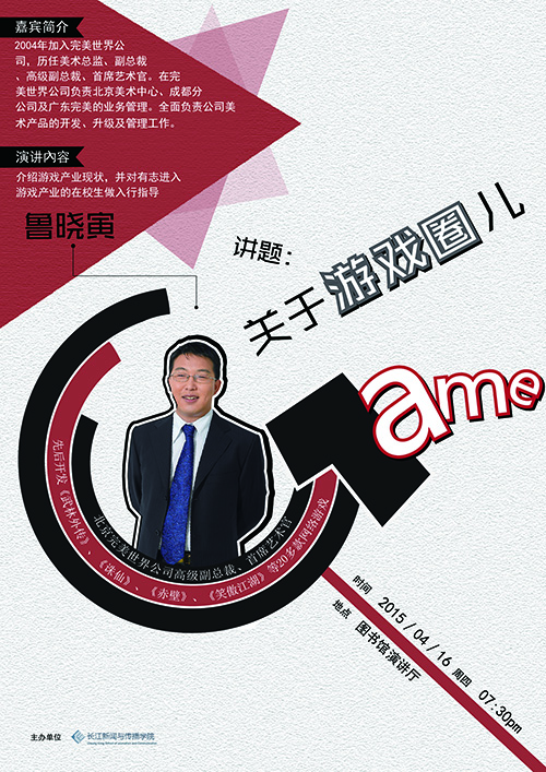 演讲的内容将对游戏产业现状做介绍,并对有志进入游戏产业的在校生做入行指导。