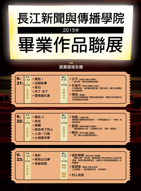 长江新闻与传播学院广播电视学专业毕业作品联展将在图书馆报告厅举行。本次毕业联展将持续三天(即 6 月 21 日至 6 月 23日),每天下午 6 时 30 分开始,共放映 9 部作品。另外,毕业联展期间,中午 1 时 30 分至下午 5 时 30 分将放映往届优秀毕业作品,欢迎大家前来观影。