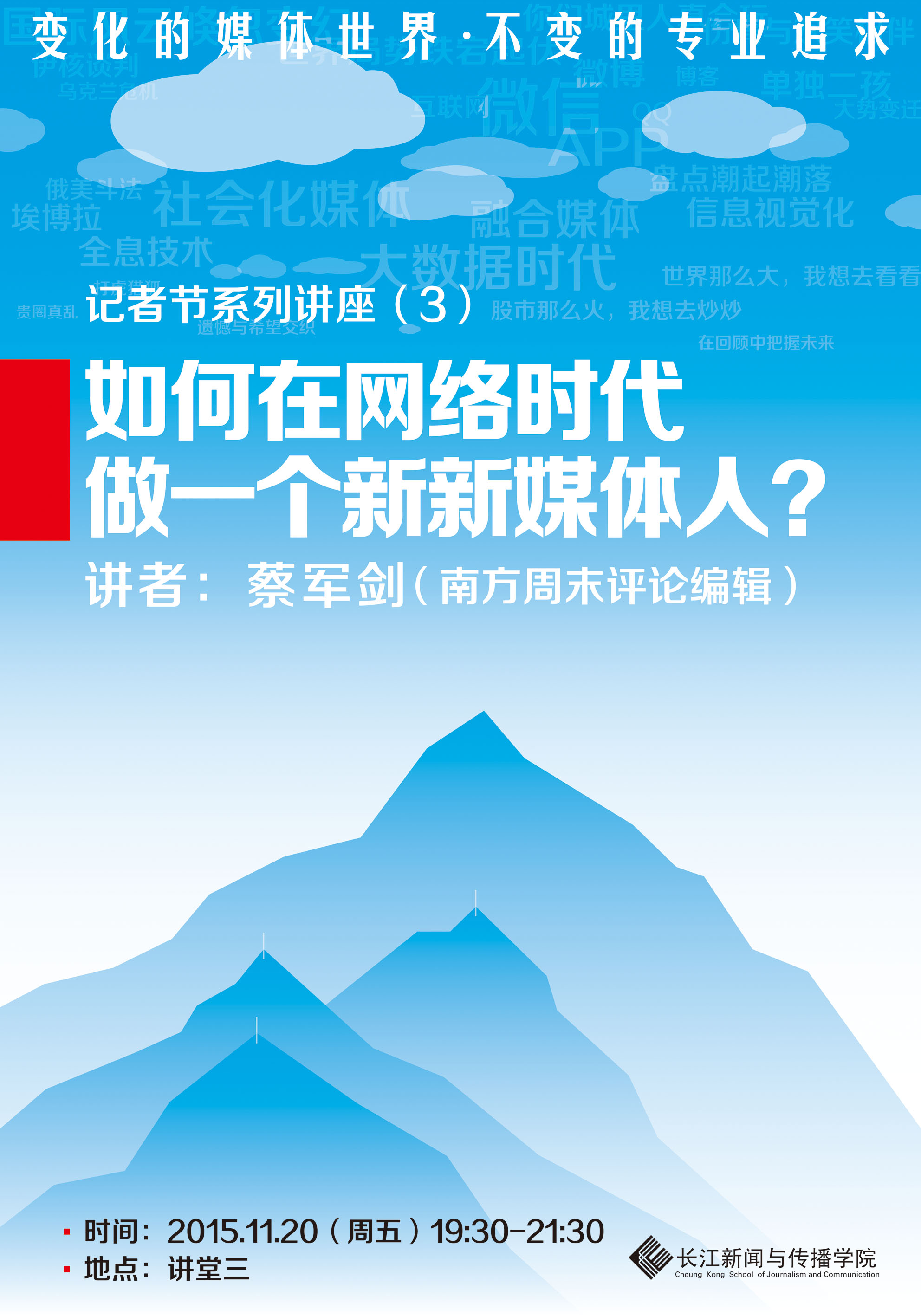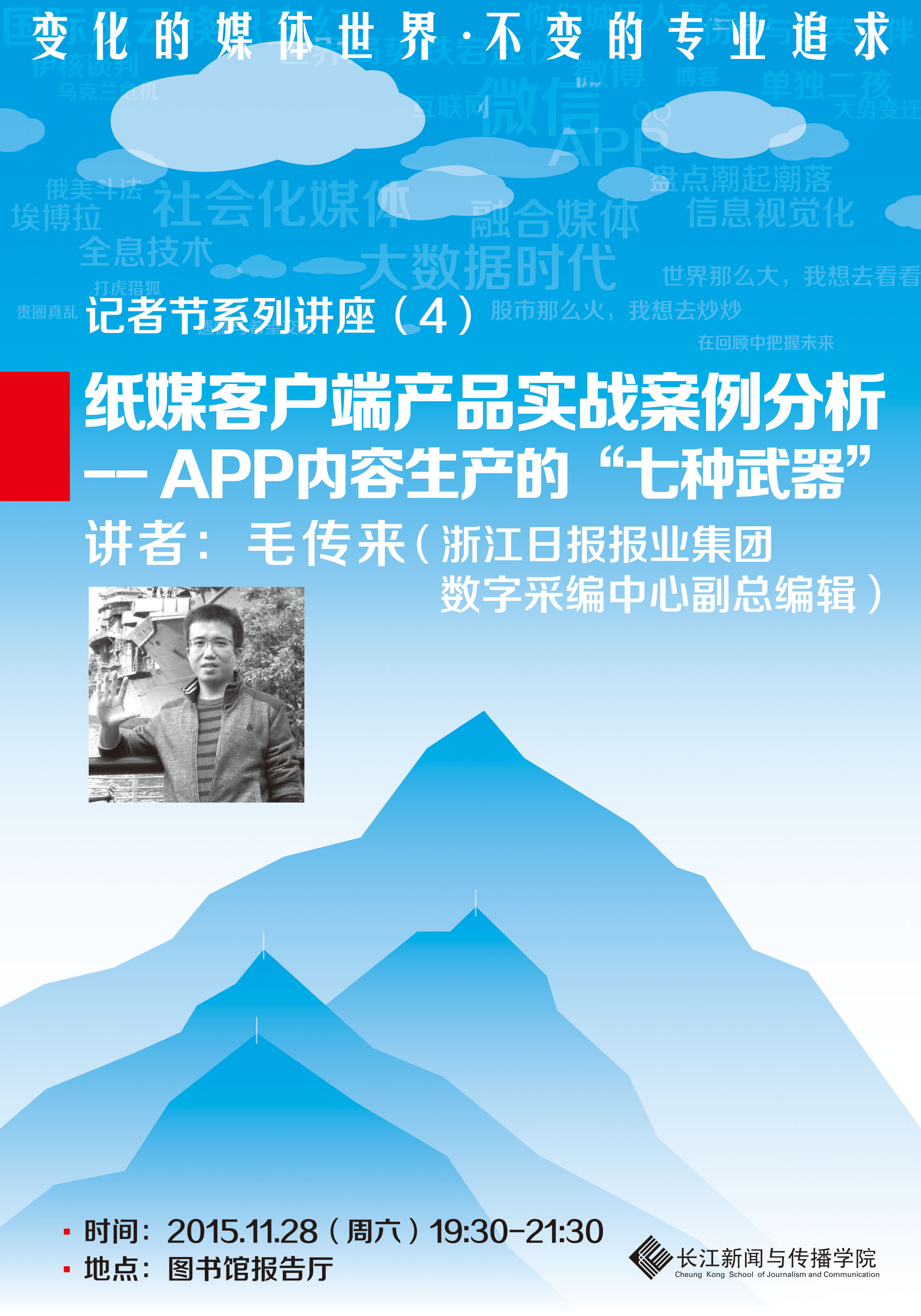 2015年记者节“变化的媒体世界•不变的专业追求”系列讲座第二弹,欢迎全校师生参加! 更多精彩内容,敬请期待!