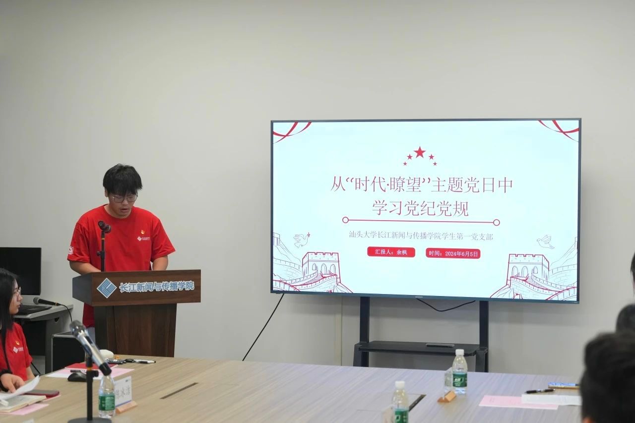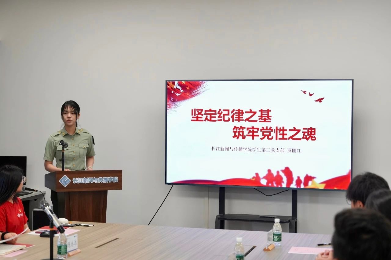 2023级硕士研究生汤瑞琳、2021级新闻学余枫和2019级广告学贾丽红等三位学生代表做主题分享,分别汇报了自身参加青马班学习、支部“时代·瞭望”时政学习活动和参军入伍后的党纪学习经历,一致表示青年党员要以党规党纪为标尺正身立行,汲取党纪学习教育之“活水”、“养分”、“阳光”,立志成为政治坚定、能力过硬、奋发向上的“常青树”。