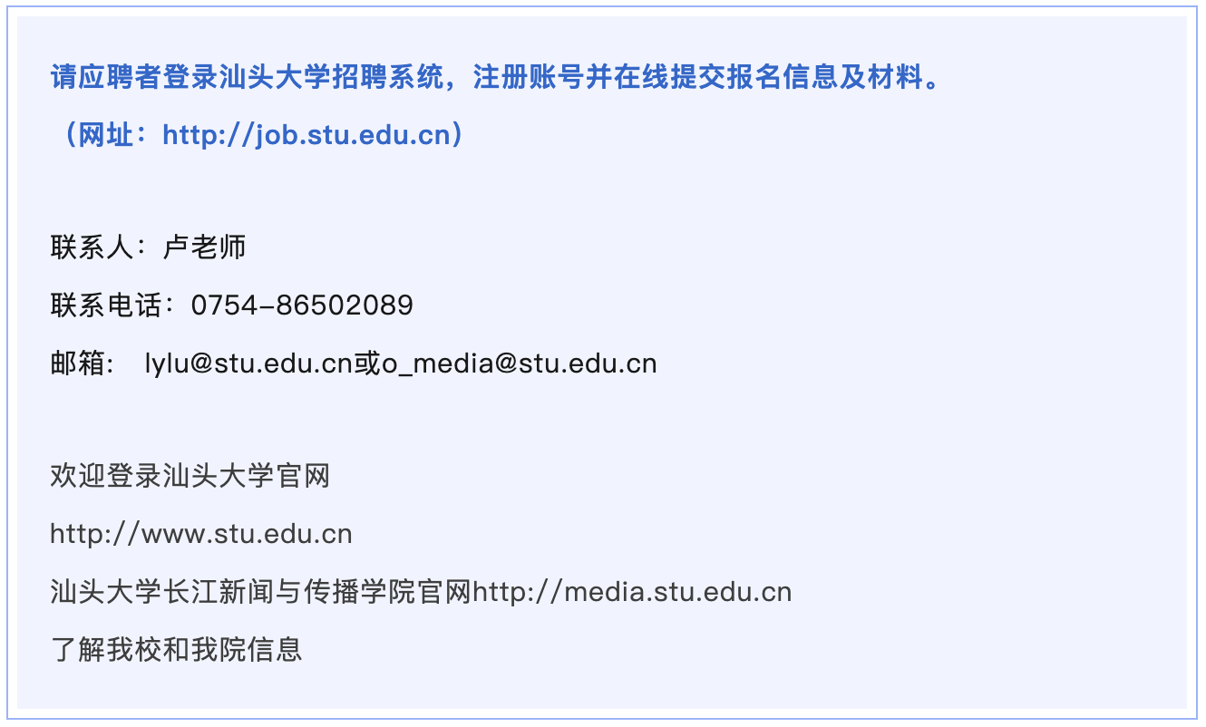 汕头大学长江新闻与传播学院秉持“国际化,重实践,前瞻性”的办学理念,建设遵循新闻传播规律和人才成长规律的全媒化复合型新闻传播人才培养体系,立足中国新传实践,面向全球化大势,拥抱新技术革命,致力于培育造就一大批政治素质高、人文修养好、理论基础厚、专业技能强的优秀新闻传播后备人才。